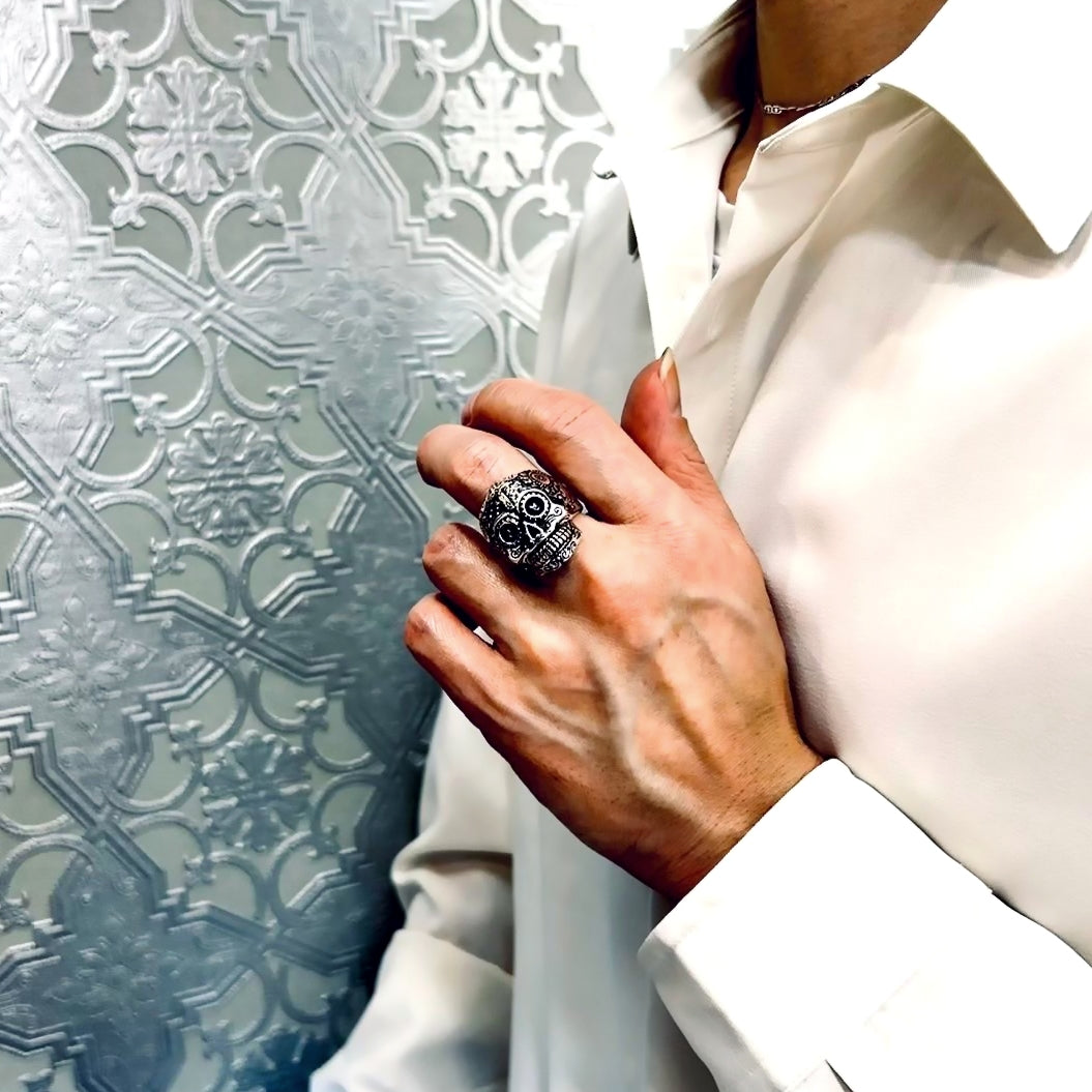 死者の日に飾る「カラベラ」とよばれるメキシカンスカルをデザインしたシルバーリング。